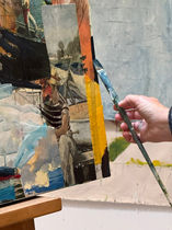 Rooted in a journey that began in film and set design before evolving into mixed-media abstraction, Perlmutter’s practice is one of continual transformation. Each canvas begins with scraps of history carefully woven into texture before color and gesture take hold, creating singular works that resonate deeply with those who encounter them.