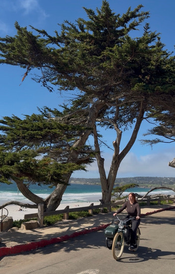 Cypress trees stretched skyward, their sculptural forms shaped by years of wind and weather. Sunlight filtered through their branches in fractured beams, illuminating glimpses of the coastline below. The cottages of Carmel-by-the-Sea appeared like fragments of a storybook, softened by age, cloaked in ivy, their uneven rooflines and textured walls offering a kind of architectural poetry that resists replication.