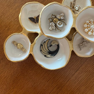 Nearby, shallow dishes shaped like moons held hand-painted faces, no two alike, each expression caught somewhere between knowing and dreaming. Gold shell bookends glinted softly, holding their place with quiet opulence. Black-striped cups introduced a modern rhythm, while candles, sculpted into finial forms, rose like miniature monuments, their wax waiting patiently for fire.